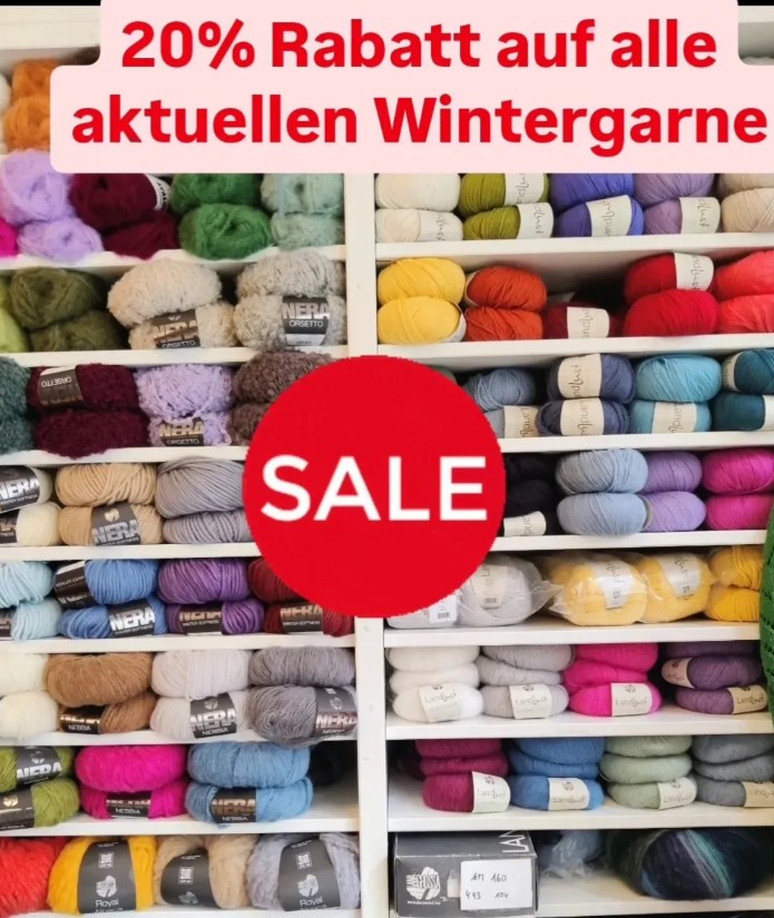Ihr bekommt auf alle aktuellen Wintergarne 20 % Rabatt. Viele weitere Qualitäten sind 30 % und mehr reduziert. Wartet nicht zu lange, die Sommergarne warten schon, in die Regale zu kommen!
