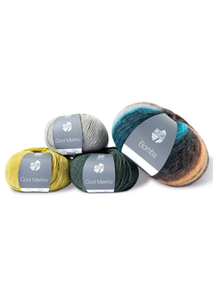 Das Set beinhaltet 3 Knäule Cool Merino und ein Knäuel Bomba sowie die Anleitung.